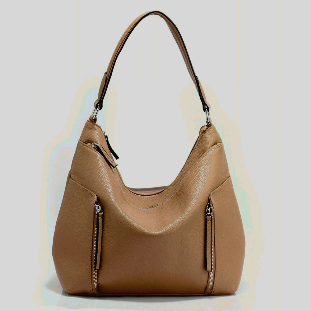 Prostorná béžová kabelka má na přední straně dvě malé svislé zipové kapsy a jednu velkou kapsu se zipem. Béžová kabelka je uzavírána na zip. Uvnitř béžové kabelky jsou dvě otevřené kapsičky a jedna zipová kapsa. Béžová kabelka je opatřena neodnímatelným popruhem přes rameno.