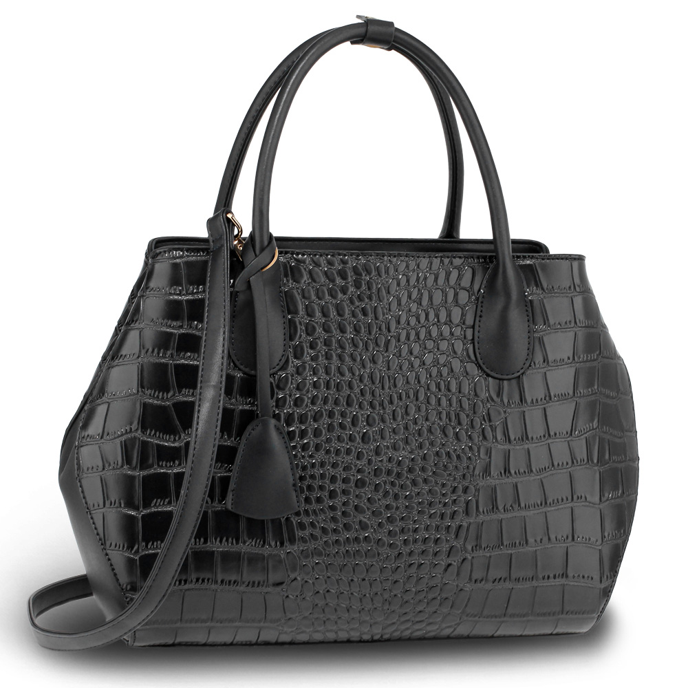 Černá kabelka s motivem krokodýlí kůže má látkovou přepážku, která vnitřní prostor kabelky rozděluje na dvě části. Na jedné z nich je zipová kapsa, na druhé jsou dvě otevřené přihrádky. Luxusní černá kabelka do ruky se uzavírá na zip. Součástí kabelky je odepínatelný popruh přes rameno. Černá dámská kabelka opatřená klíčenkou. Černá kabelka má mírně lesklý povrch.