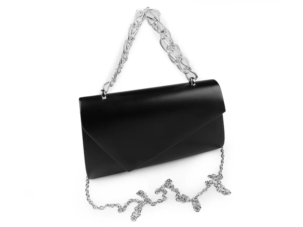 Luxusní černá malá kabelka psaníčko má sešikmenou klopu, zdobená řetězovým uchem do ruky. Klopa černé kabelky psaníčka se zapíná na magnetický cvoček. Uvnitř se nachází malá kapsička na drobnosti. Součástí černé společenské kabelky psaníčka je odnímatelný stříbrný řetízek pro nošení přes rameno jako crossbody. Černou dámskou kabelku můžete nosit v ruce.