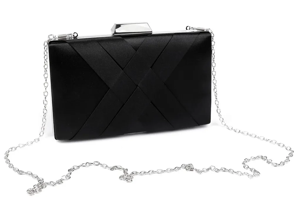 Elegantní společenská kabelka psaníčko má na přední straně zkříženou aplikaci. Černé psaníčko má po celém obvodu stříbrný rámeček. Součástí psaníčka je stříbrný odnímatelný řízkový popruh přes rameno. Luxusní kabelka psaníčko je vyztužené. Vstup do kabelky psaníčka je přes stříbnou hranatou sponu.