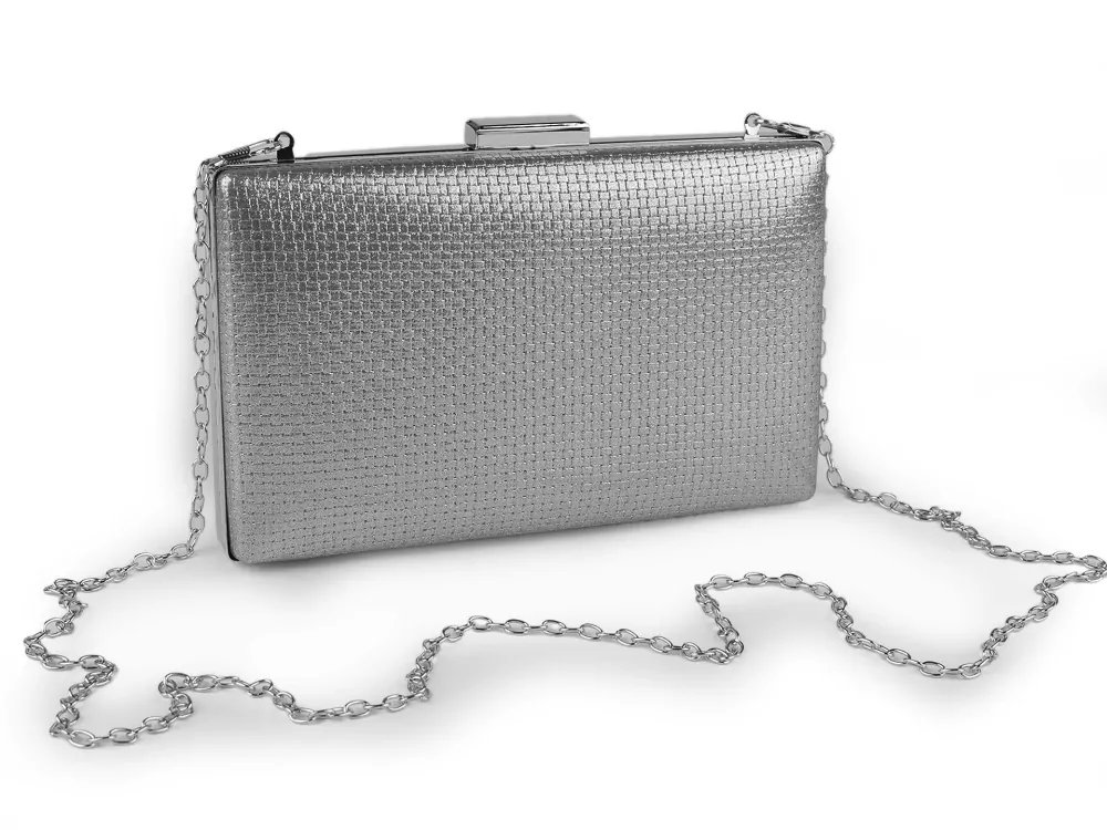 Společenská tmavě stříbrná malá kabelka pasníčko má metalický lesk. Povrch tmavě stříbrné kabelky psaníčka má zajímavou kostičkovou strukturu. Tmavě stříbrnou kabelku zdobí výrazné lesklé zapínání a rámeček po celém obvodu. Pevně vyztužená tmavě stříbrná kabelka psaníčko má dlouhý odnímatelný řetízkový popruh pro nošení přes rameno jako crossbody. Metalické tmavě stříbrné psaníčko můžete nosit v ruce.