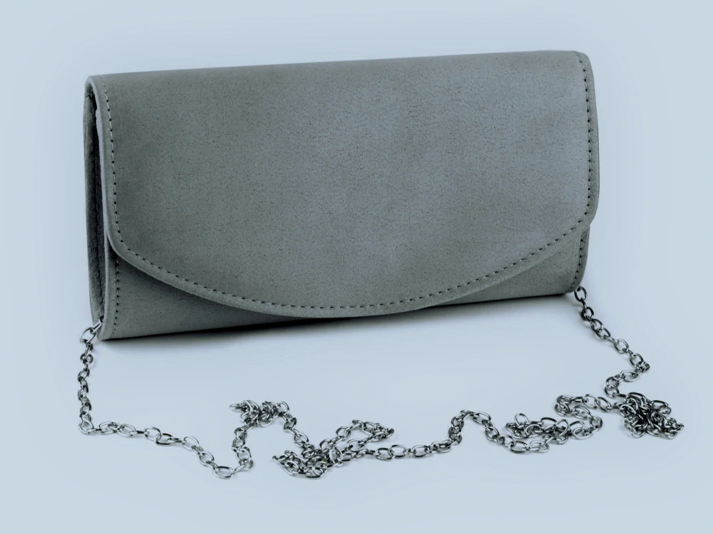 Světle šedé semišové psaníčko do ruky je ideálním doplňkem pro večerní akce a slavnostní příležitosti.