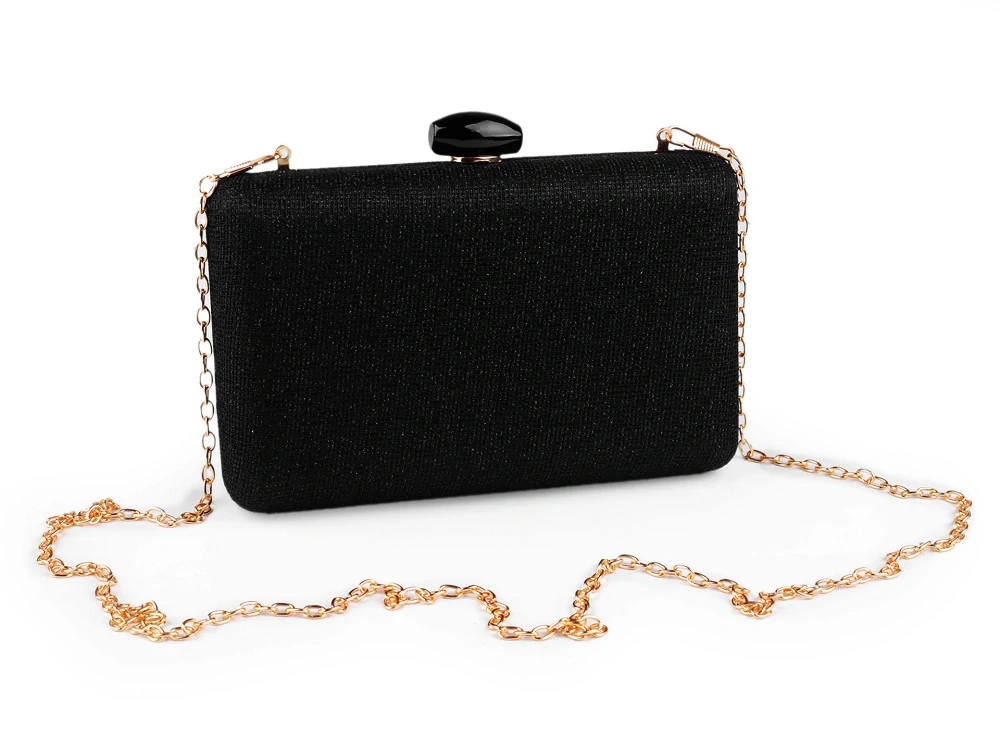Pevně vyztužená skořepová kabelka černé barvy má zlatý odnímatelný řetízek pro nošení přes rameno jako crossbody. Černou kabelku ve stylu psaníčka se dá nosit také v ruce. Černé psaníčko zdobí velké oválné zapínání.