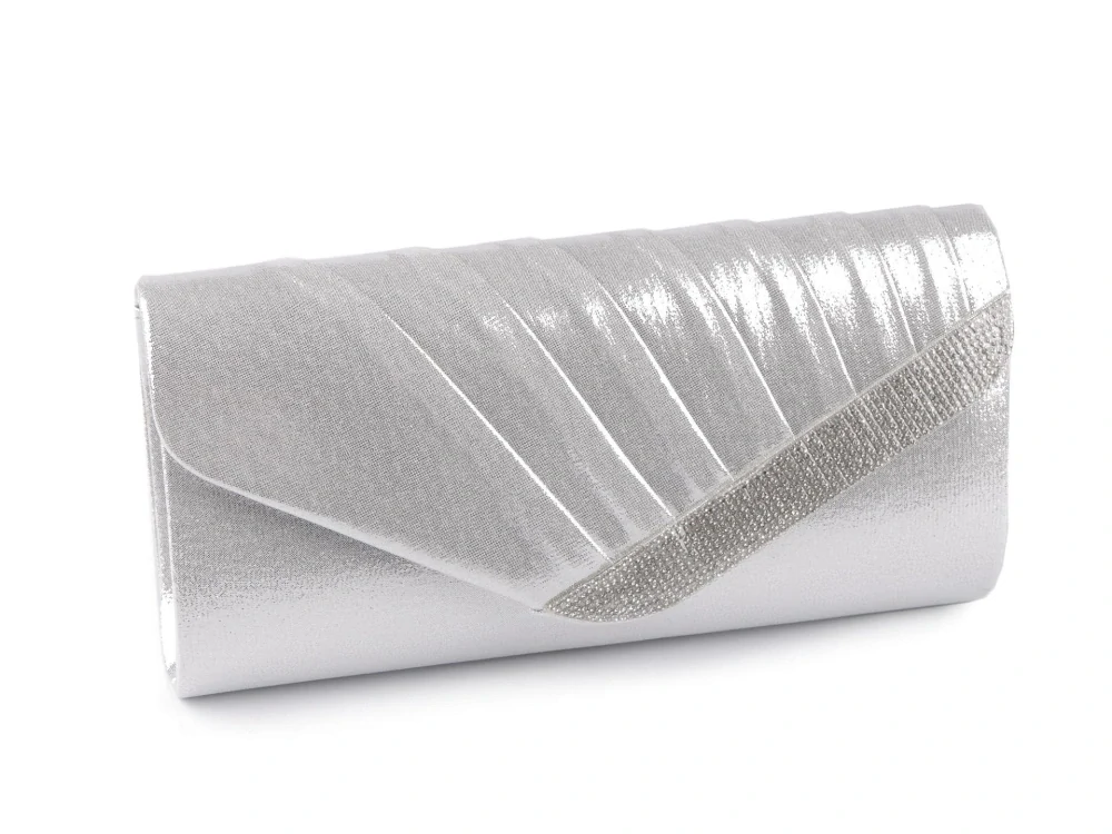 Elegantní stříbrné psaníčko má luxusní vzhled a třpyt. Celé stříbrné psaníčko má texilní potah. Přední strana stříbrné kabelky psaníčka je nařasená. Pevné vyztužené stříbrné psaníčko má polyesterovou podšívku s malou kapsičkou na drobnosti. Stříbrné dámské psaníčko se zapíná na magnet. Společenská stříbrná kabelka psaníčko má odnímatelný stříbrný řetízek pro nošení přes rameno. Stříbrné psaníčko můžete nosit v ruce.
