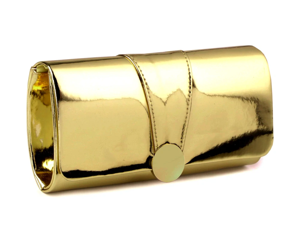 Elegantní lesklé lakované zlaté psaníčko má kulaté zapínání na magnet. Uvnitř zlaté kabelky psaníčka se nachází malá kapsička na drobnosti. Součástí luxusní zlaté kabelky psaníčka je odnímatelný řetízkový popruh přes rameno. Vyztužené dámské zlaté psaníčko můžete také nosit jen tak v ruce. Do zlaté kabelky psaníčka můžete vložit mobilní telefon, líčidla nebo malou peněženku.